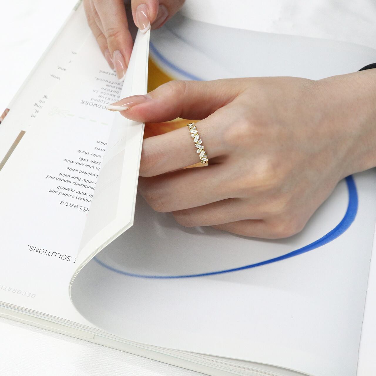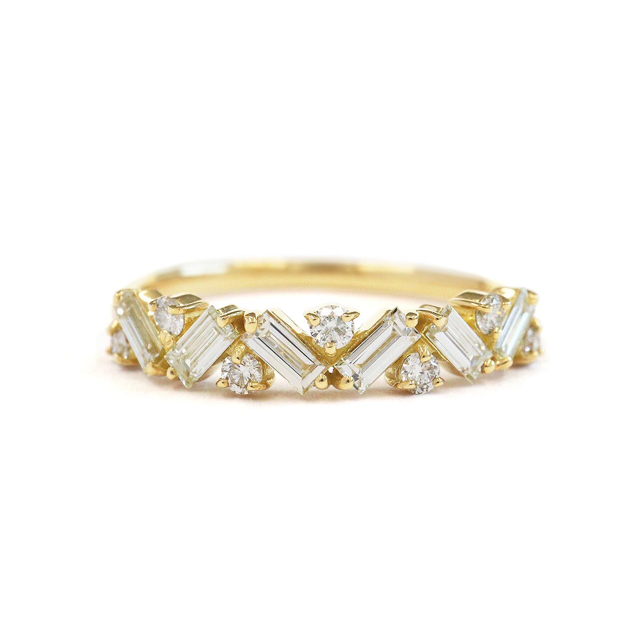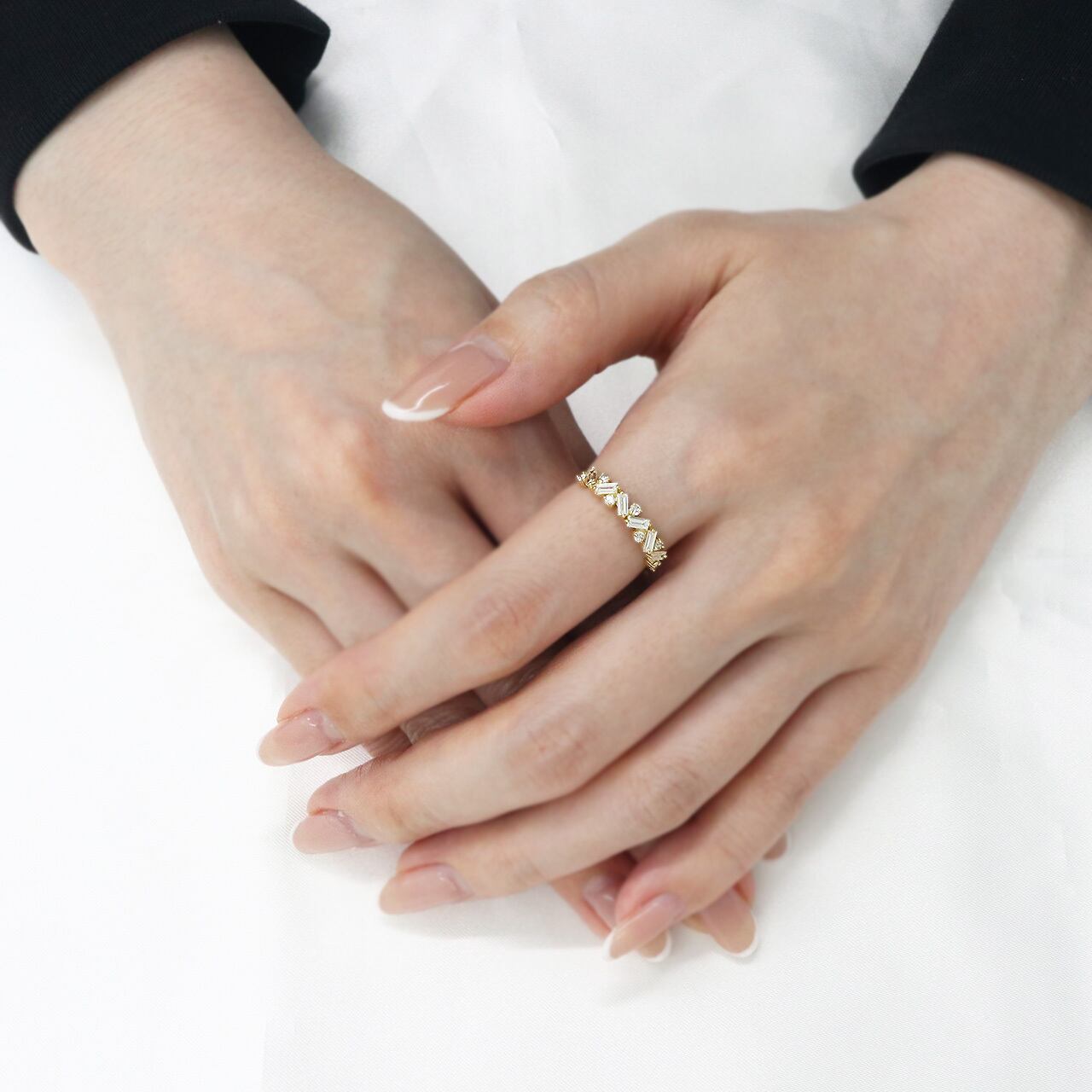 バゲットカットダイヤモンドのすっきりとした煌めきと、ラウンドカットのキラキラとした輝きを交互にセットし、リズミカルなデザインの新しいエタニティリングです。