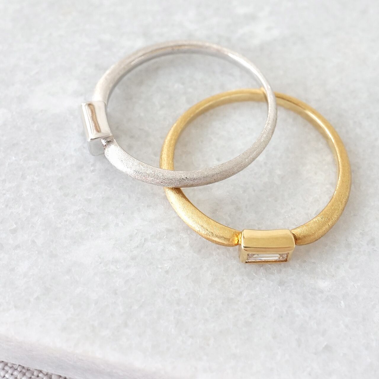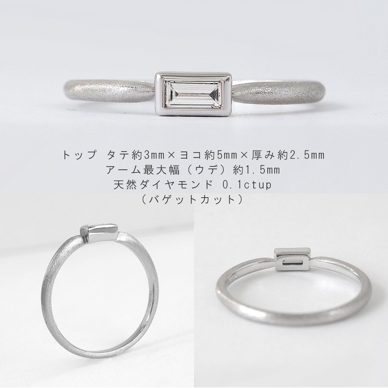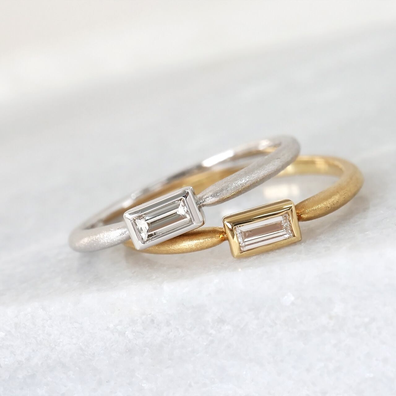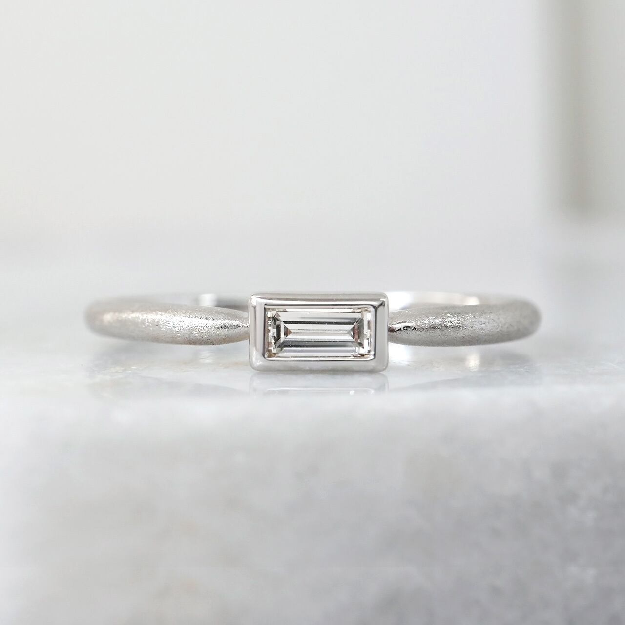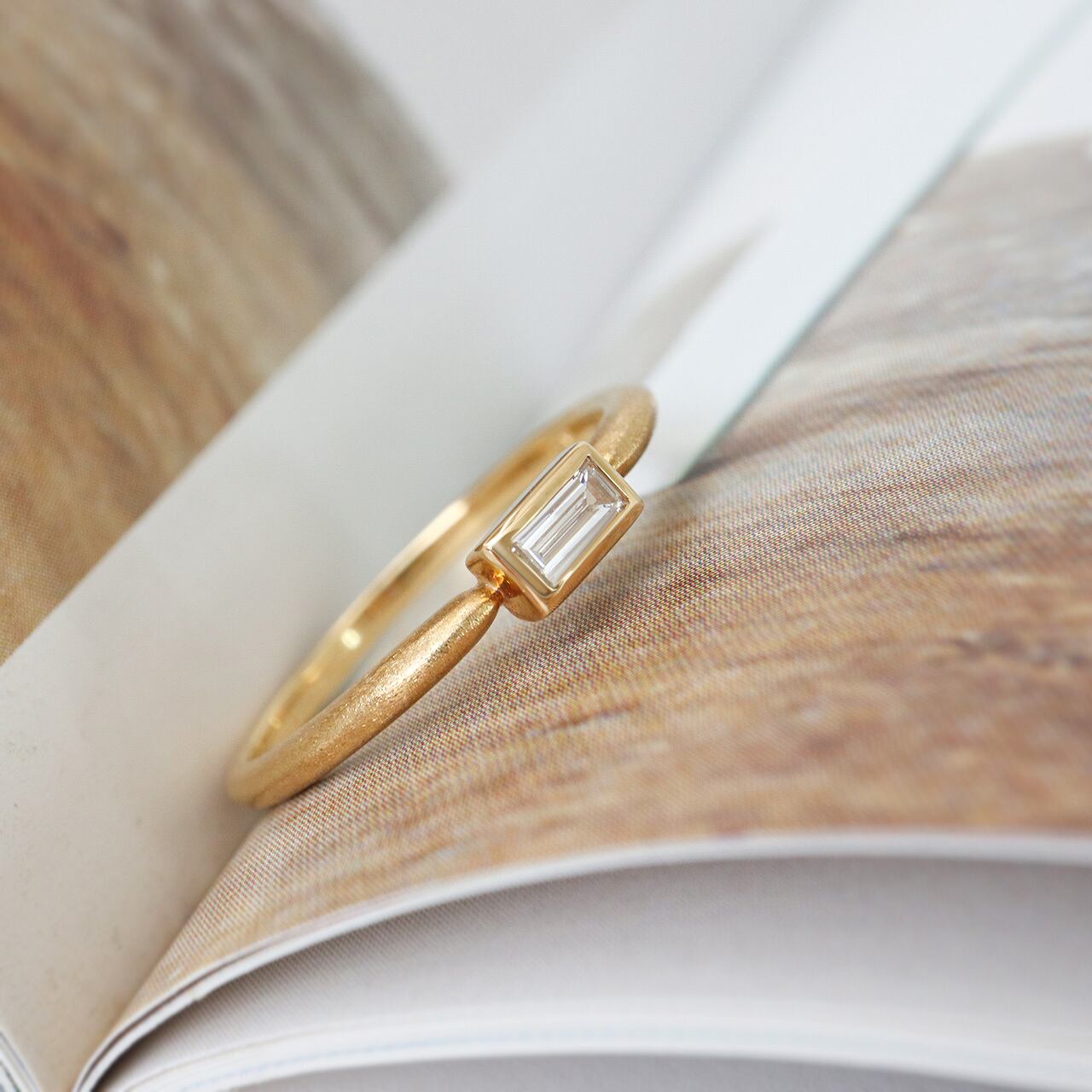 バゲットカットの凛とした煌めきが目を引く、シンプルな一粒ダイヤモンドリングです。