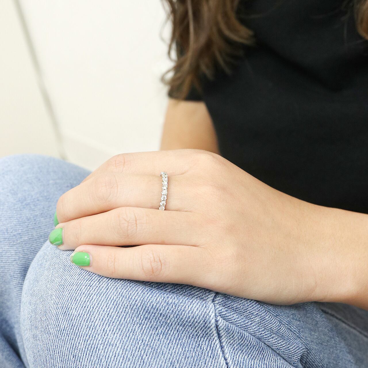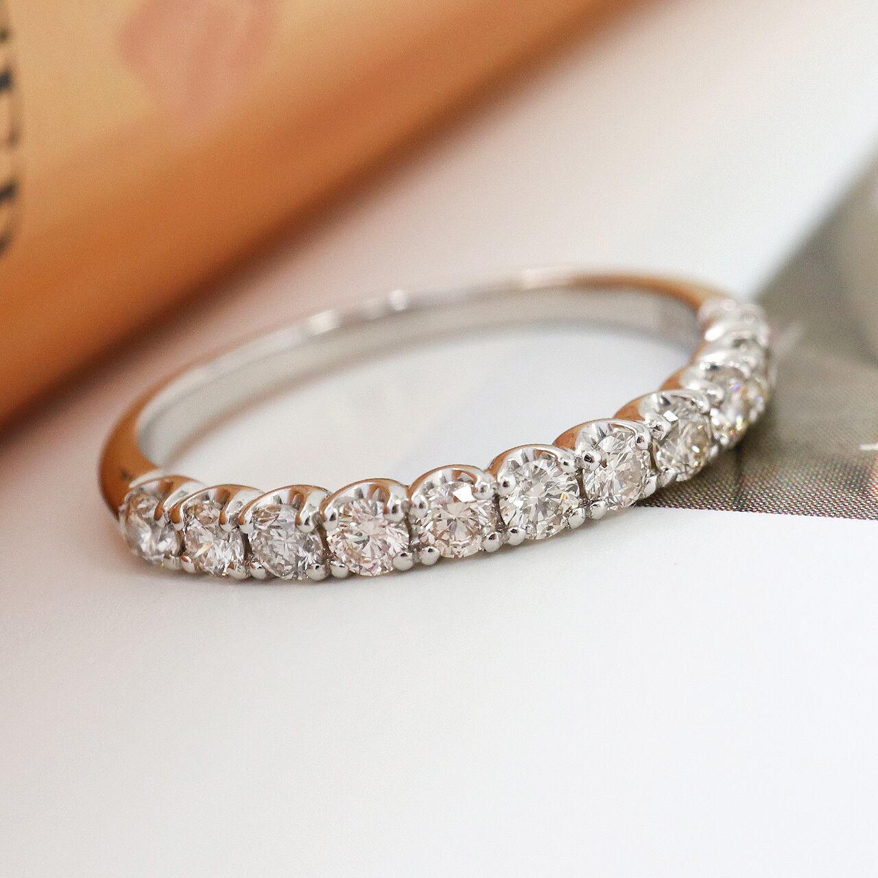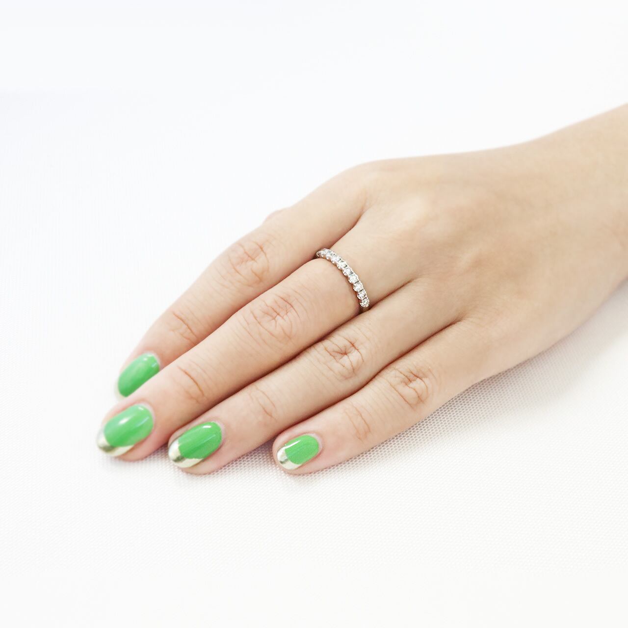 繊細な「爪留め」の定番ハーフエタニティリングは、女性らしく優しい印象を与えます。