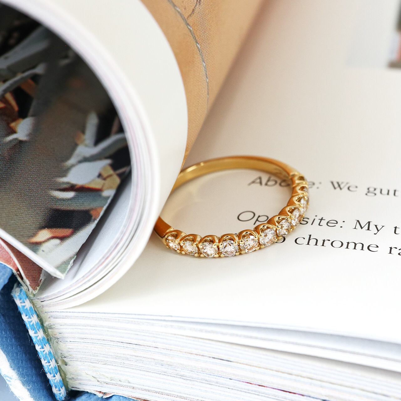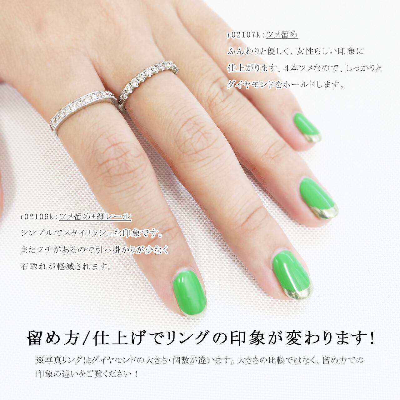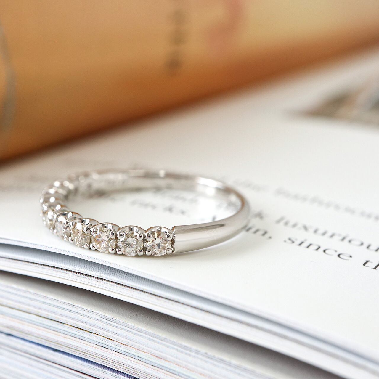 繊細な「爪留め」の定番ハーフエタニティリングは、女性らしく優しい印象を与えます。