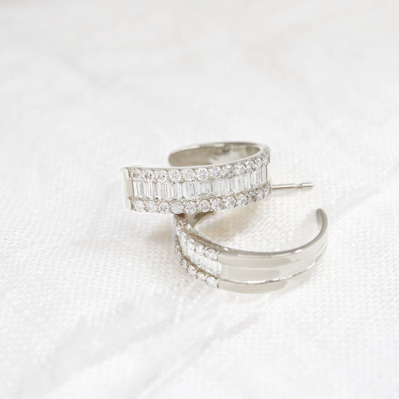 敷き詰めたバゲットカットダイヤモンドがクールに煌めき、サイドにセットしたメレーダイヤモンドが輝く繊細なフープピアスです。