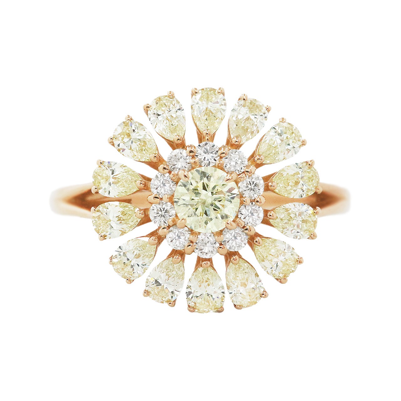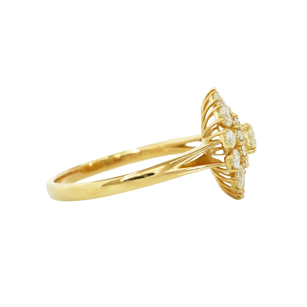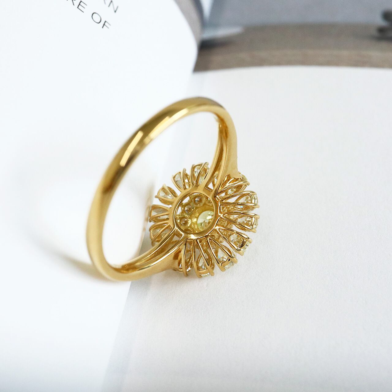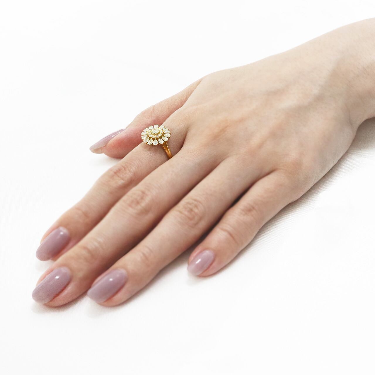 大振りでありながらも、繊細なデザインが特徴のこのリングは、咲き誇る花の華やかさを持っています。ペアシェイプカットダイヤモンドの花びらが大人可愛い印象も与えつつ、さりげなく豪華な輝きが手元を飾ります。特別な日にも、普段使いにもぴったりのアイテムです。