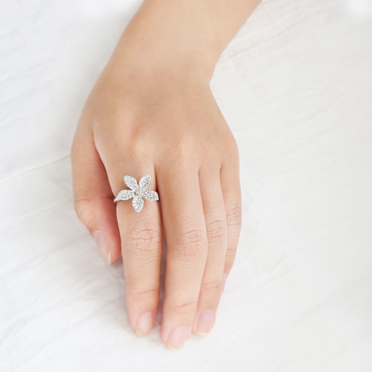 甘くなりがちなフラワーモチーフを大人顔にするのはパヴェの輝きだからこそ。