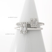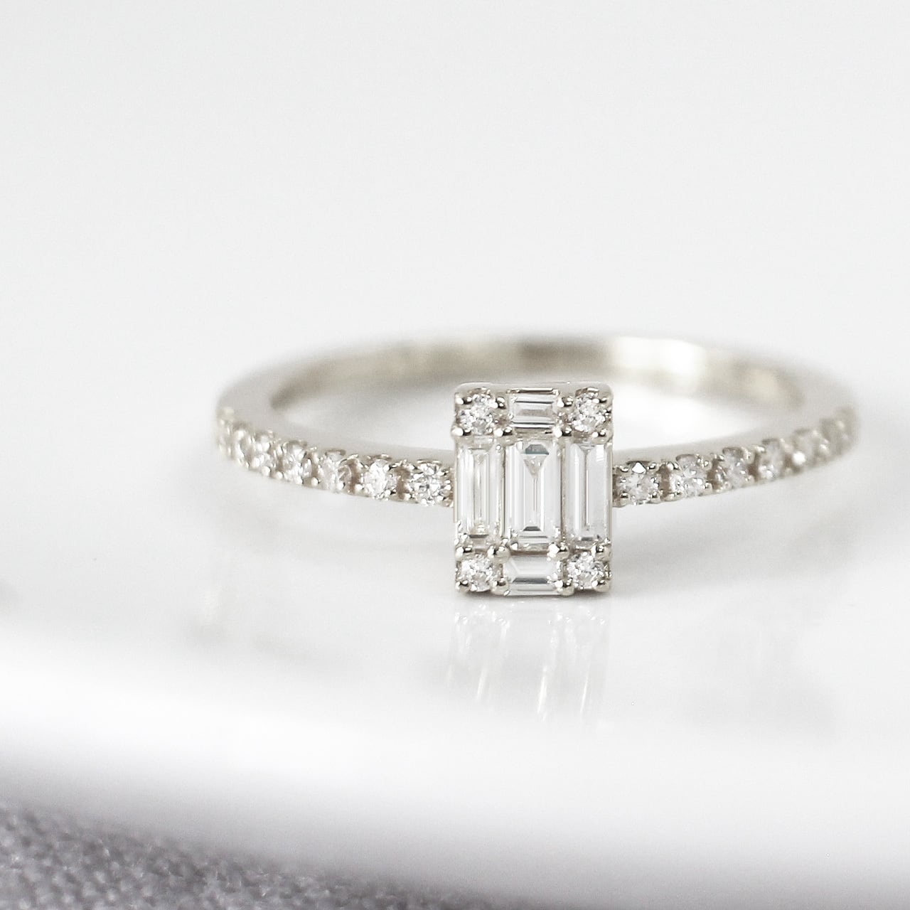 希少なバケットカットダイヤをラウンドダイヤと組み合わせて、スクエアのトップがスタイリッシュな指輪です。