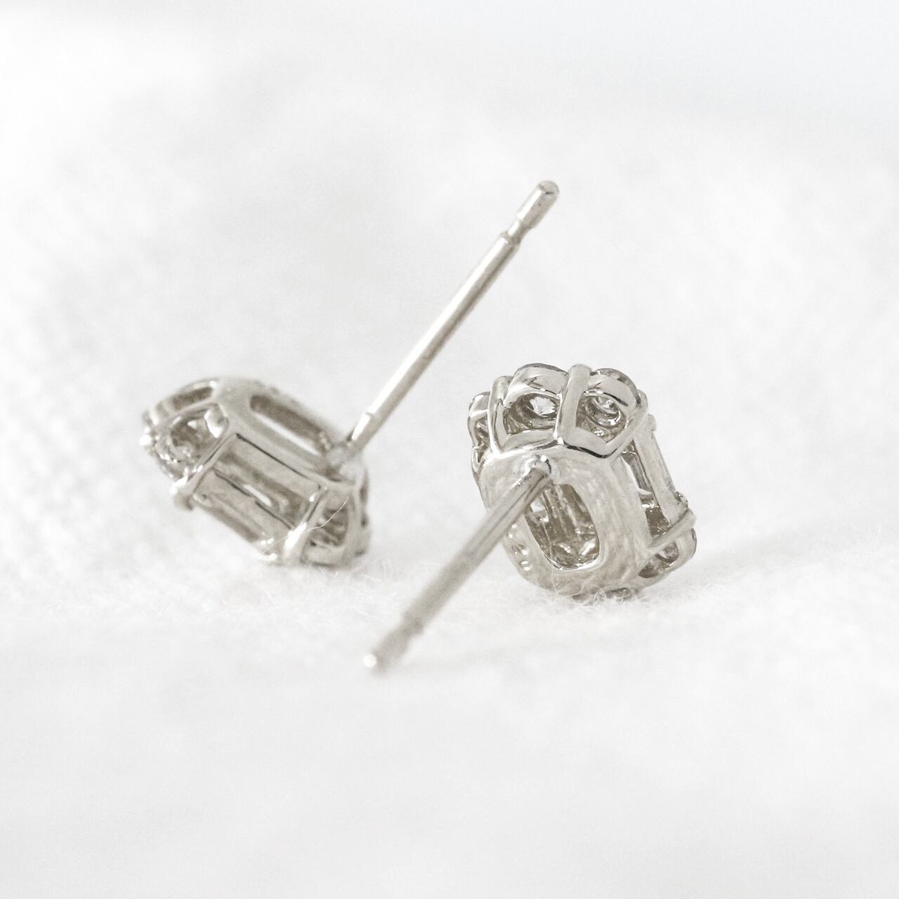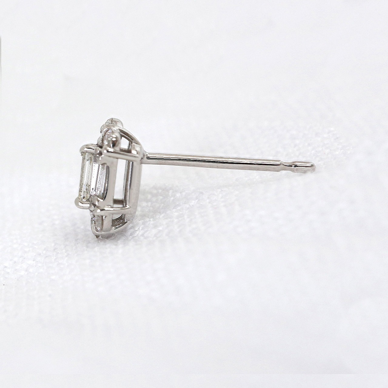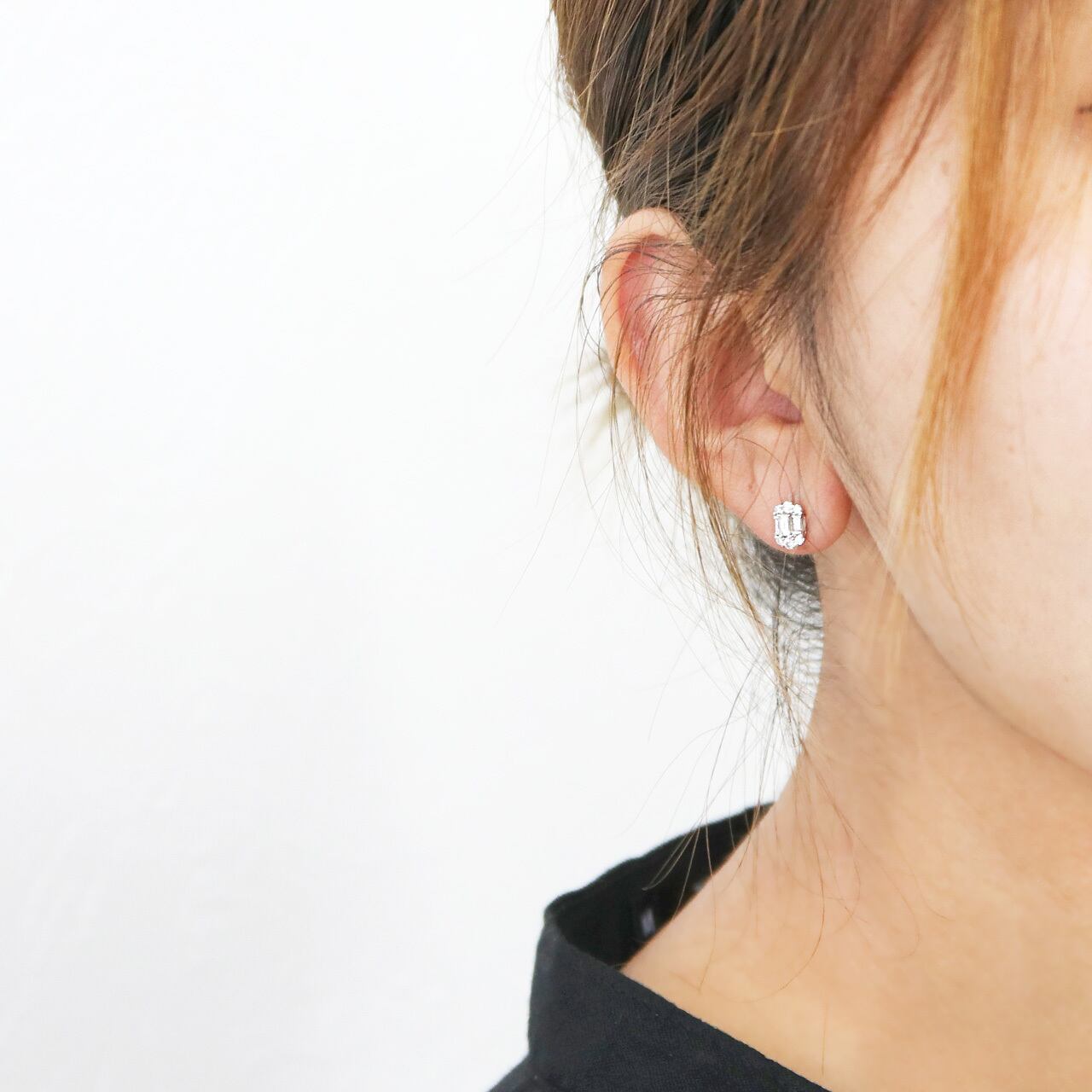 バゲットカットダイヤの上下にラウンドカットダイヤをあしらって、シャープなスクエアピアスに女性らしさをプラスしました。