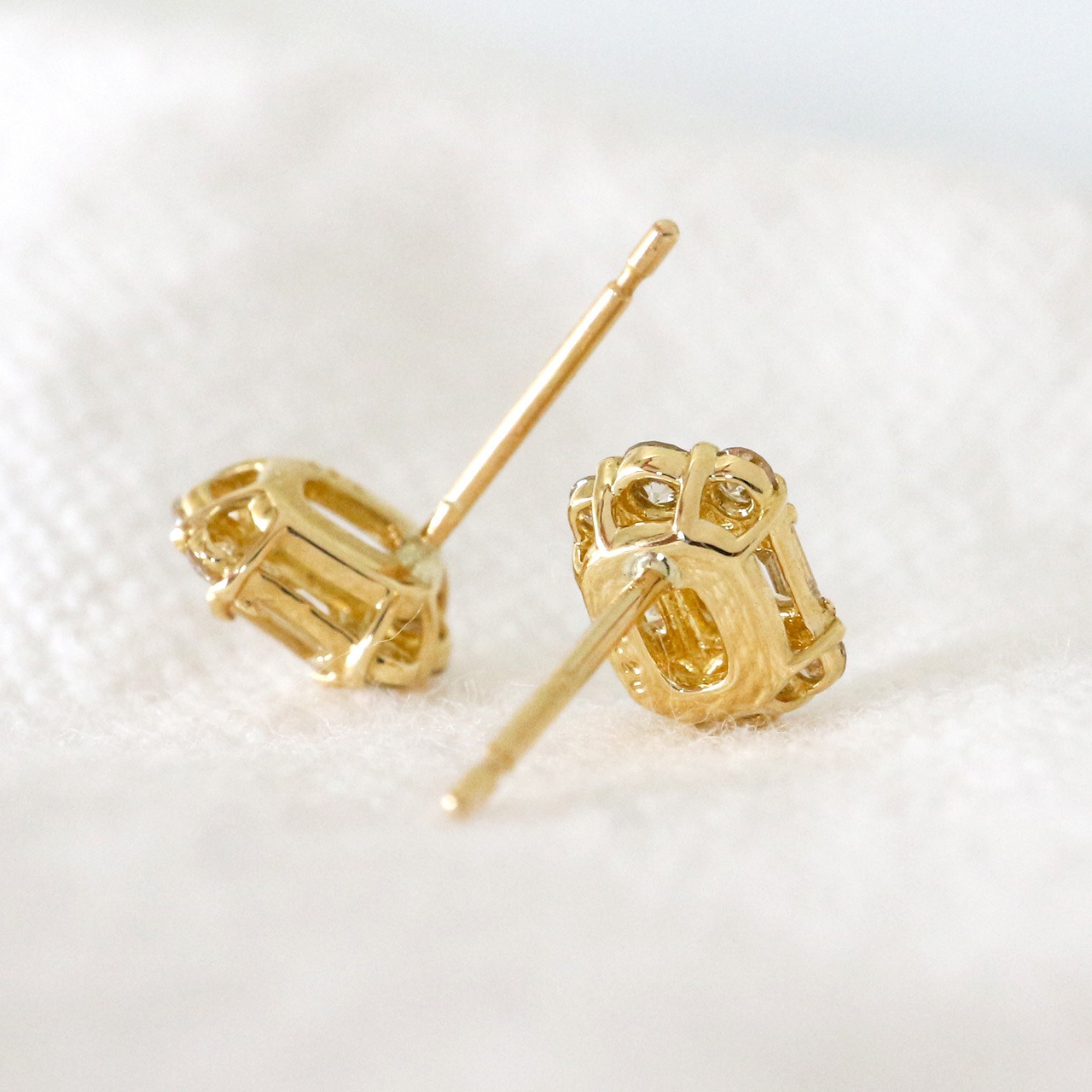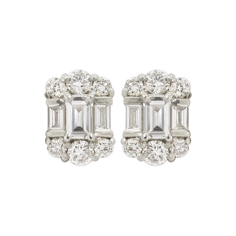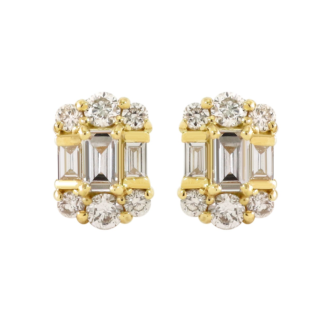 バゲットカットダイヤの上下にラウンドカットダイヤをあしらって、シャープなスクエアピアスに女性らしさをプラスしました。
