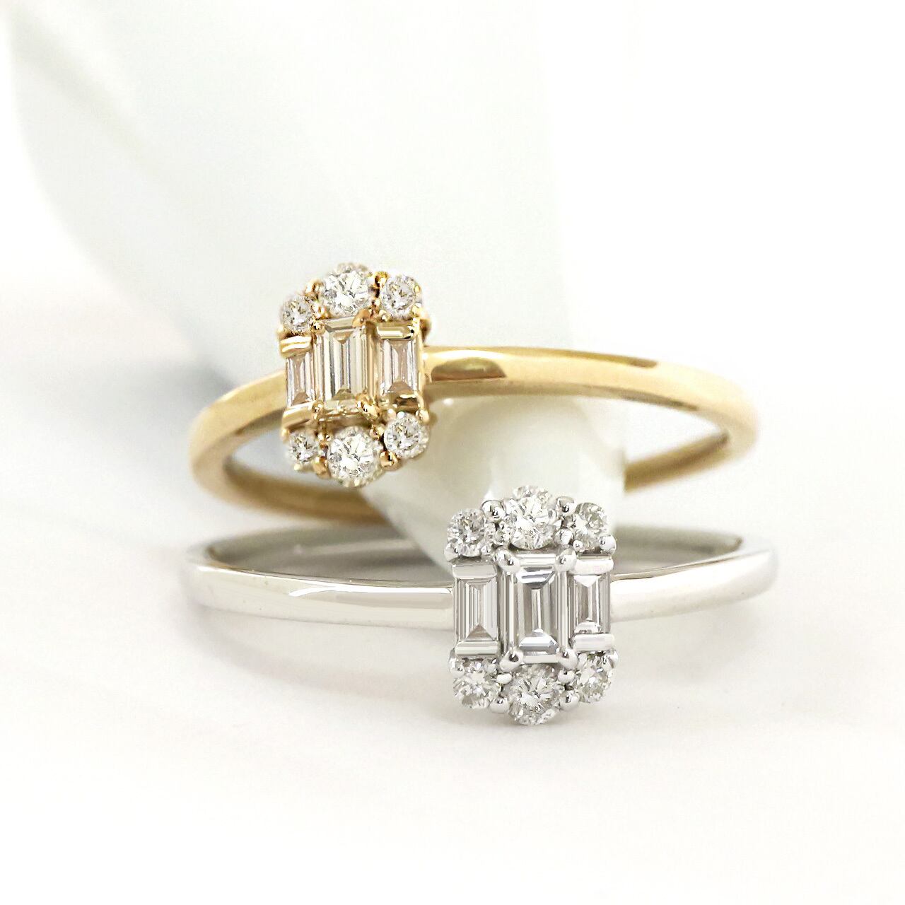 バゲットダイヤの上下にラウンドカットダイヤモンドをあしらって、シャープなスクエアデザインに女性らしさをプラスしました。