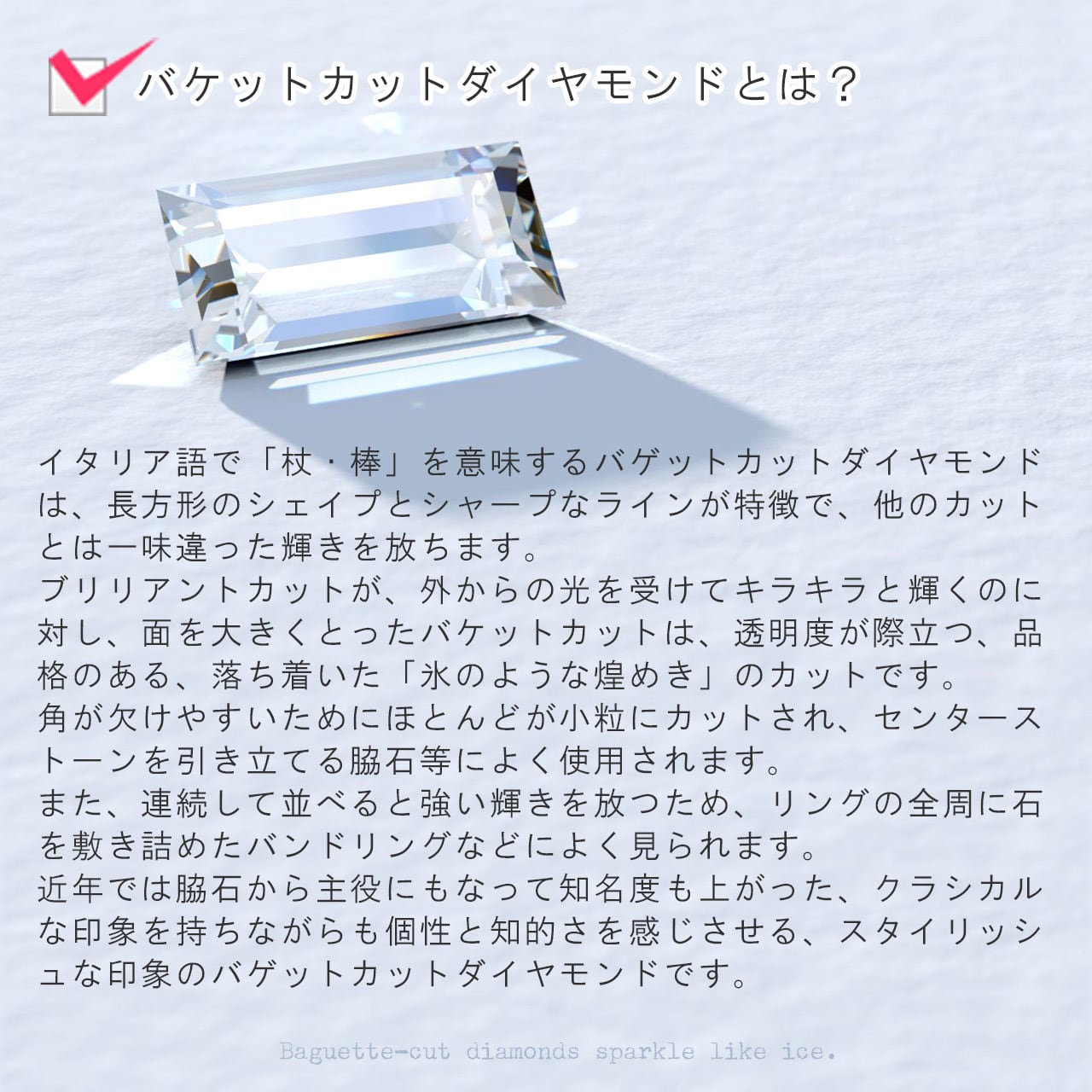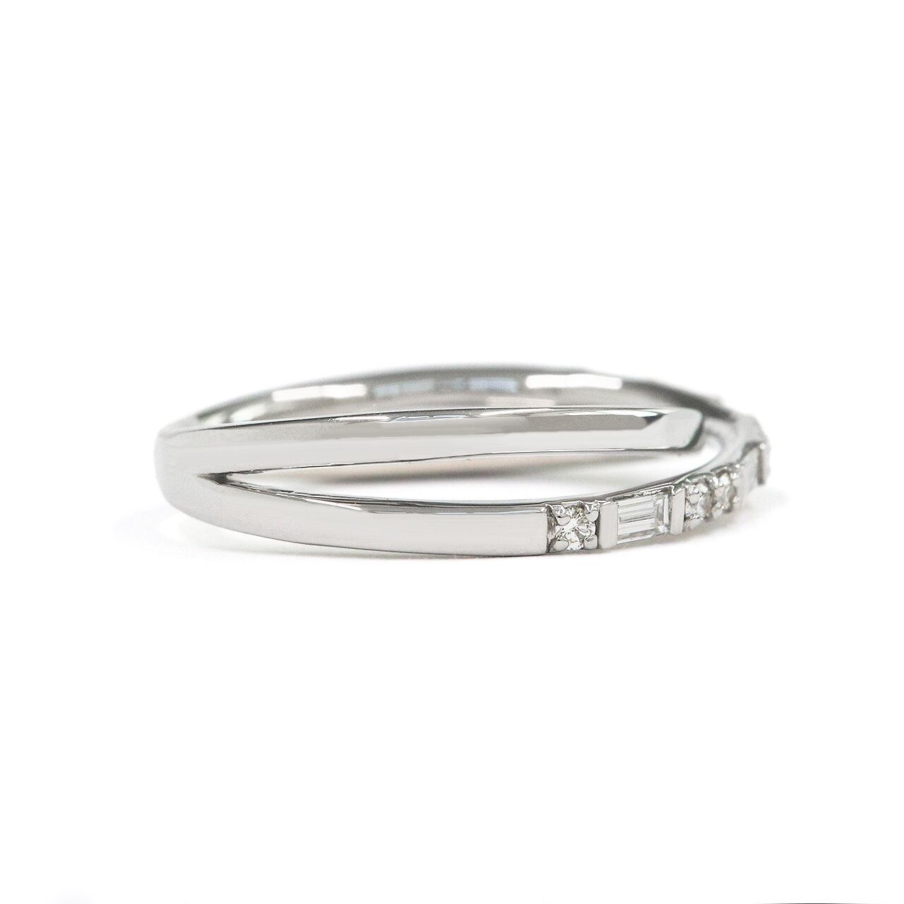シャープな輝きを放つバゲットカットダイヤモンドを贅沢にセットし、モダンでスタイリッシュな印象に仕上げました。