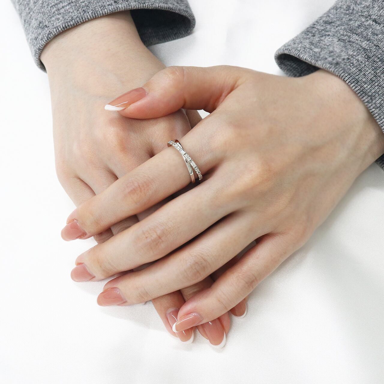 地金とダイヤモンドのラインが美しく交差する、洗練されたクロスリング(Xリング)。